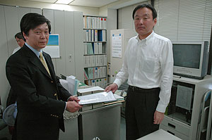 6月4日午前、コアメンバーの杉山精一(歯科医師)、オピニオンメンバーの長岐祐子(歯科衛生士)、事務局秋元秀俊は、厚生労働省大臣秘書室に瀧ヶ平仁大臣付を訪ね、署名の山とともに陳情趣意書を手渡しました(写真右)。つづいて医政局歯科保険課に日高勝美歯科保健課長を訪ね大臣宛陳情趣意書の写しを提出し、「歯科衛生士法の誤った解釈の是正」を求めるとともに「歯科衛生士法の改正作業に着手」することを要望しました。