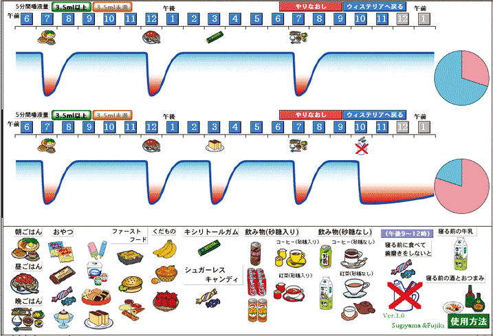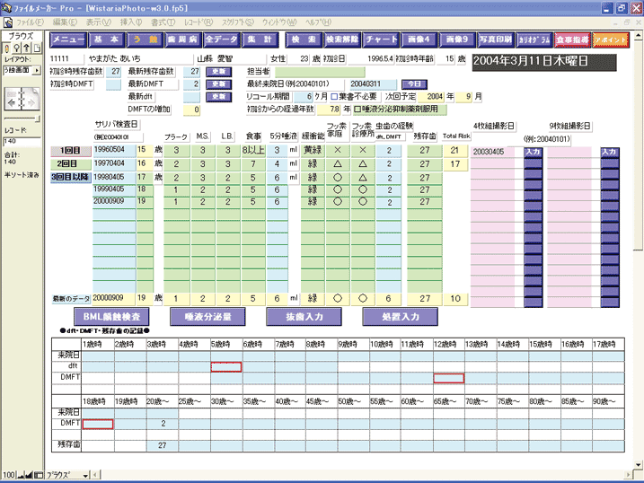 - サリバ検査のデータ(プラーク、M.S.、L.B.、食事回数、5分唾液量、緩衝能、フッ素使用状況、DMFT(dft))の記録