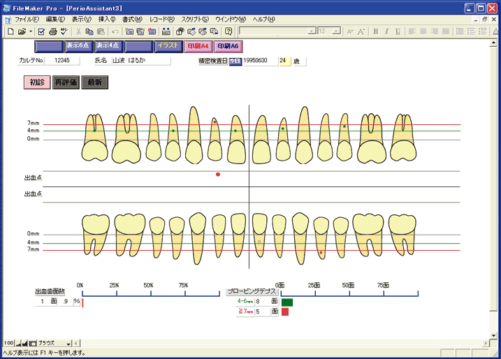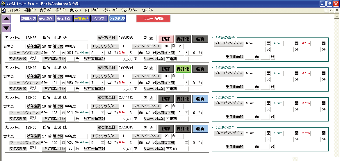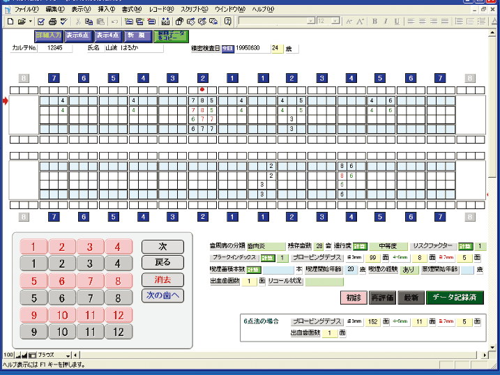 - 歯周病のデータ(分類、進行度、リスクファクター、プラークインデックス、プロービングデプス(6点法)、出血面数、喫煙経験の有無、喫煙本数、リコールの状況)の記録
