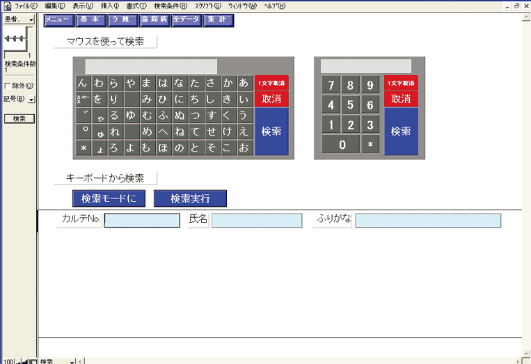 | 患者検索画面 | 基本画面 | う蝕画面 | 唾液ファイル画面/抜歯履歴/処置履歴 |