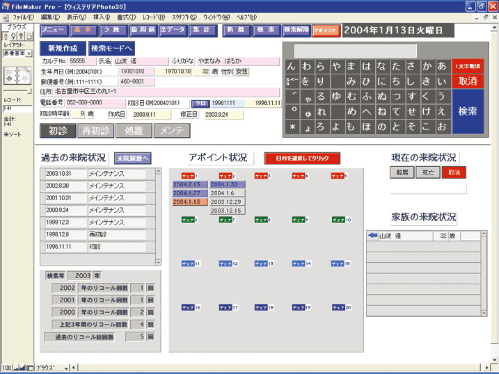 - カルテNo、氏名、住所、生年月日、電話番号、初診日を記録