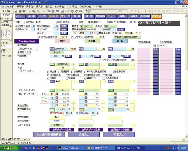 患者管理データベース《ウィステリアPro》は、患者カルテデータ、う蝕の検査データや歯周病の検査データをすべて蓄積するためのPerioAssistant機能、来院履歴、処置履歴、抜歯履歴、唾液量などさまざまなデータの蓄積が可能です。確実なメインテナンスに重要なリコール管理もできます。
