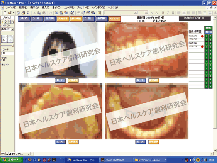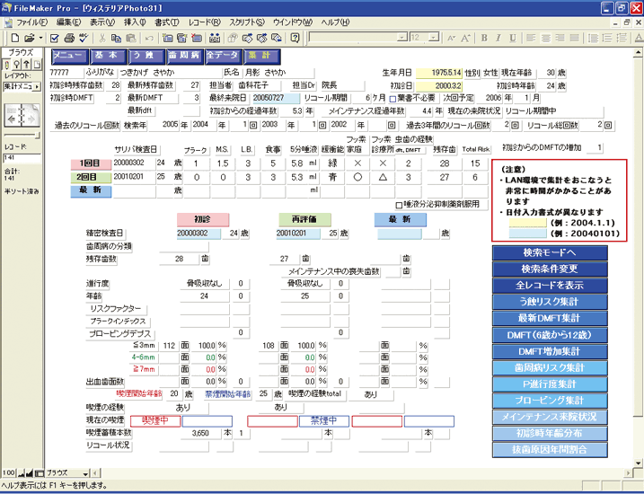 さらに“Factory's FileMaker Plug-in 2”というソフトを使うことによって、外部にある大量の画像ファイルを効率よく管理できます。口腔写真を必要なときにいつでも表示できるため、他のデータとともに動機づけに大きな威力を発揮します。集計機能も充実し、幅広い活用ができます。