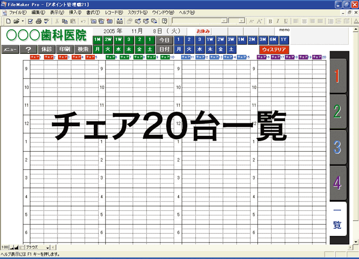 チェアサイドで各チェアのアポイント状況を把握し、リコールのアポイントをスムーズに決定するためのソフト(ファイルメーカーPro・テンプレート)です。このソフトは診療所ごとに異なる休診日、担当歯科衛生士名などを設定し、カスタマイズしたうえで出荷しています。
