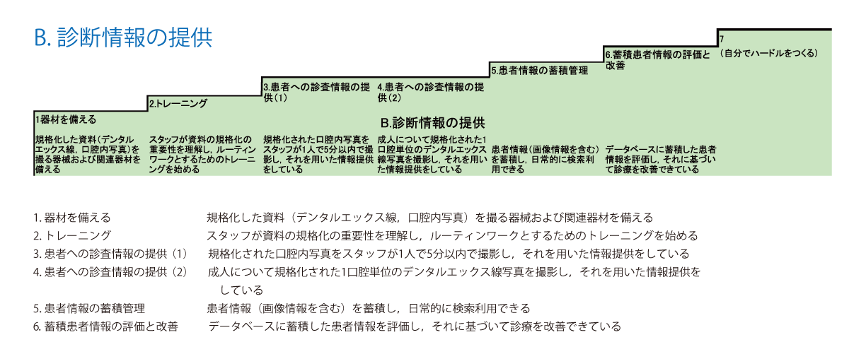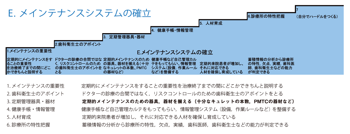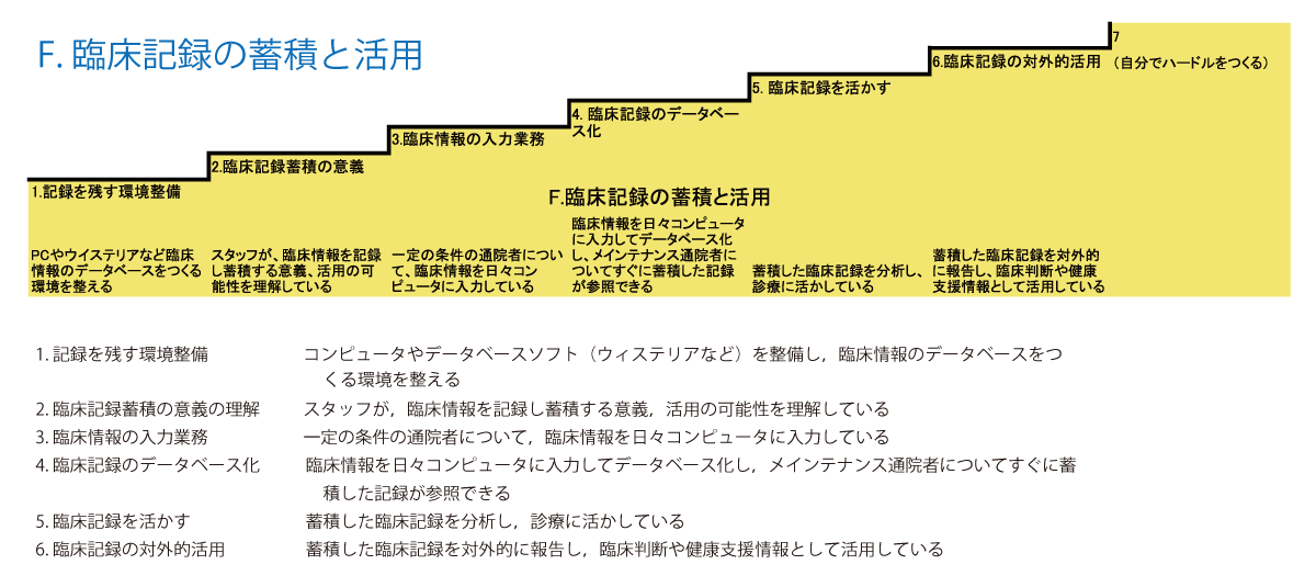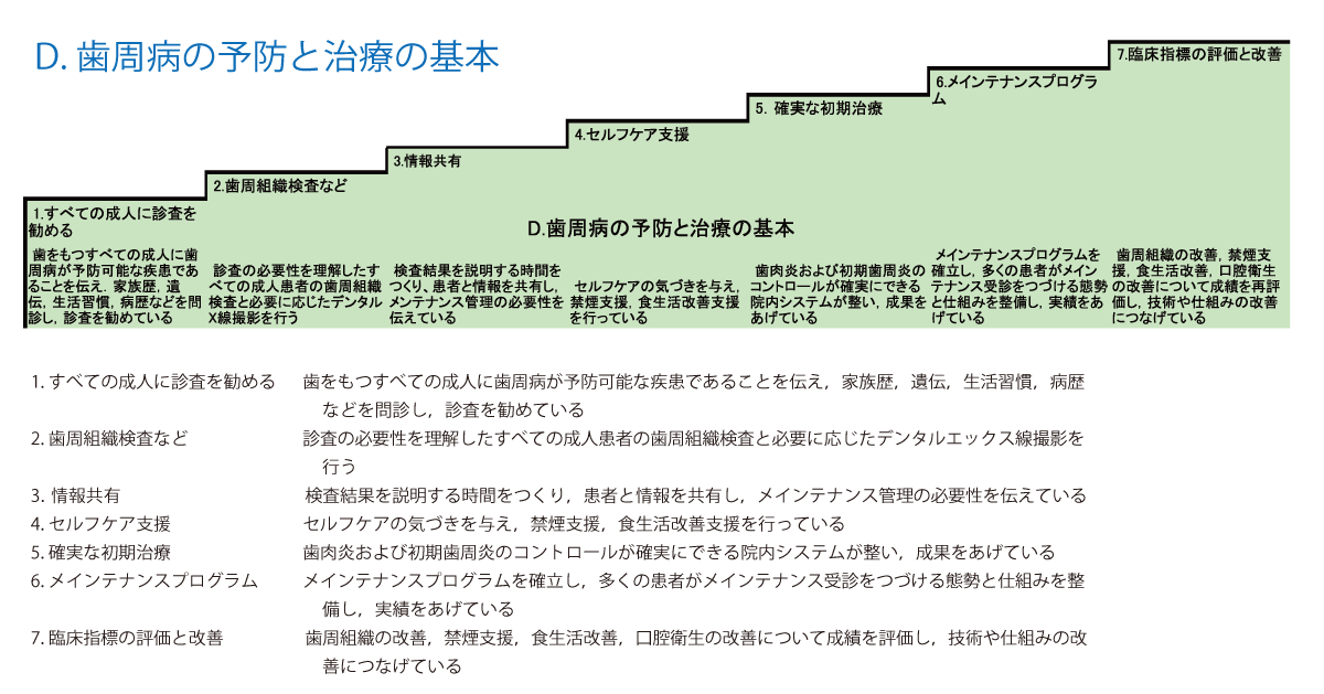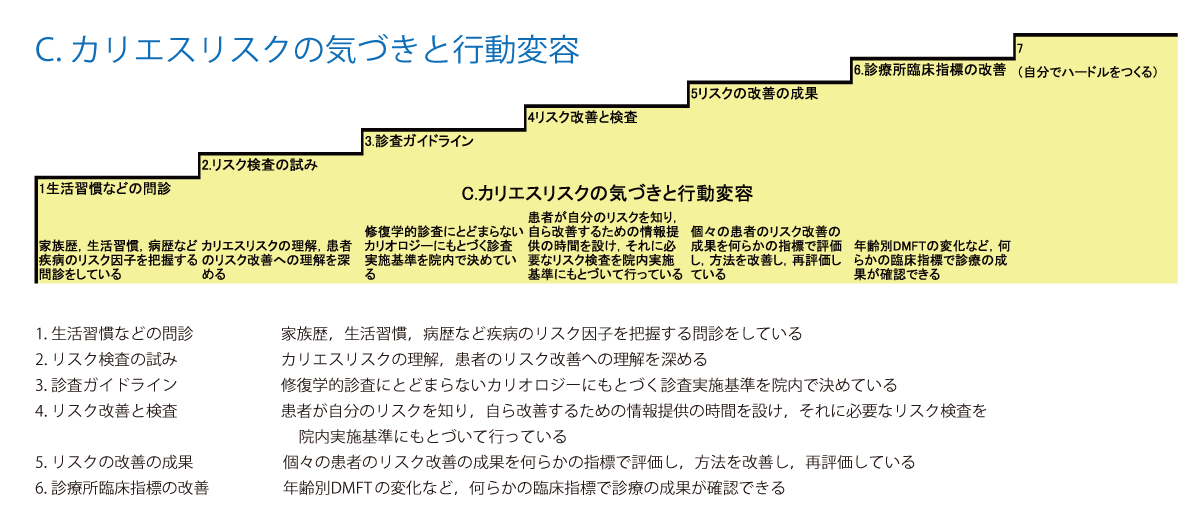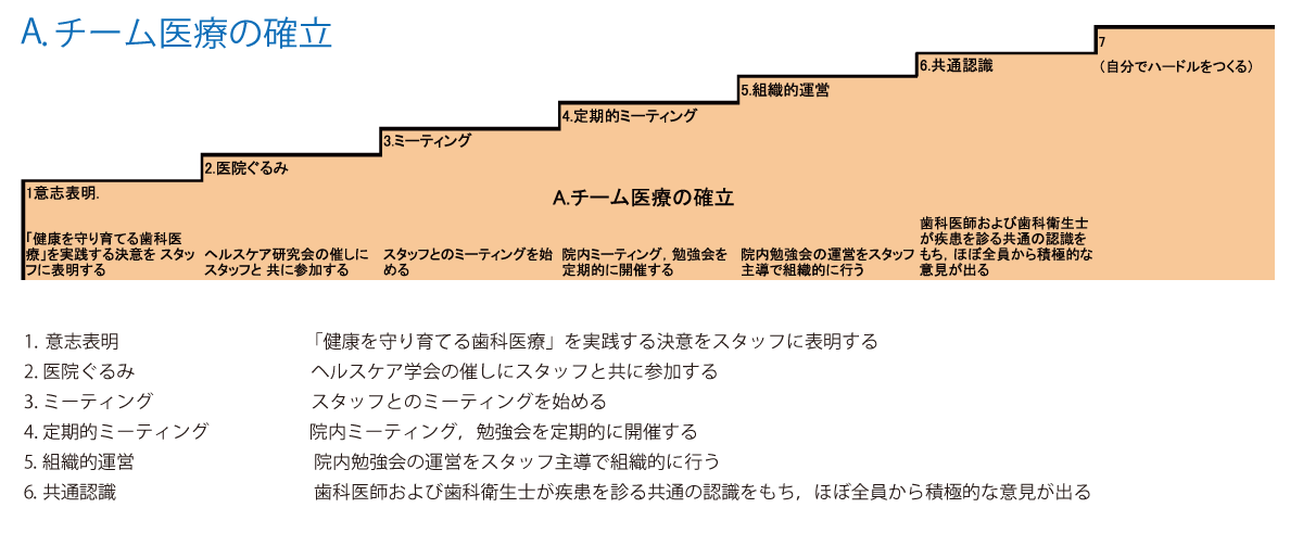 まず、院長自身がヘルスケア歯科診療をすると心に決めたら、スタッフの理解を得ることからスタートです。A~Fの6項目に分けて、認証診療所にステップアップするためのガイドを示します。