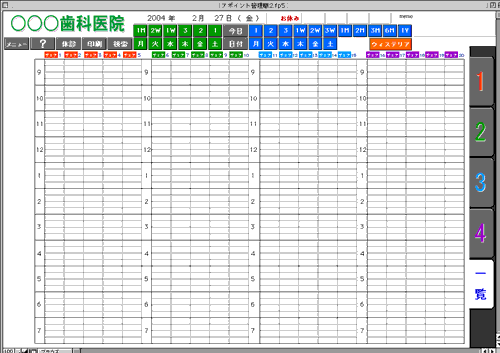 アポイント管理職はチェアサイドで各チェアのアポイント状況を把握し、リコールのアポイントをスムーズに決定するためのソフト(ファイルメーカー Pro・テンプレート)です。診療所ごとに異なる休診日、担当歯科衛生士名などを設定し、カスタマイズしたうえで出荷しますので、お申込いただいた後で必 要事項記入用紙をお送りします(ファイルメーカーPro7以上が別途必要です)。