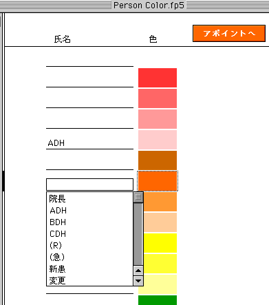 担当者名(画面上ではADH、BDH)によって患者さんの氏名に色が付き、担当者の判別が付きやすくなりました。