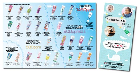 学会では、小児用品店やドラッグストアで販売されている歯磨剤および歯磨剤類似品について調査を行いました。フッ素濃度については、商品パッケージに記載 されている数値、記載のないものについては、メーカーホームページおよびお客様窓口に問合せました。一般の消費者が子どもの発育にあわせて小児用歯磨剤をきちんと選択できるようなパンフレット作成しました。ご活用ください。
