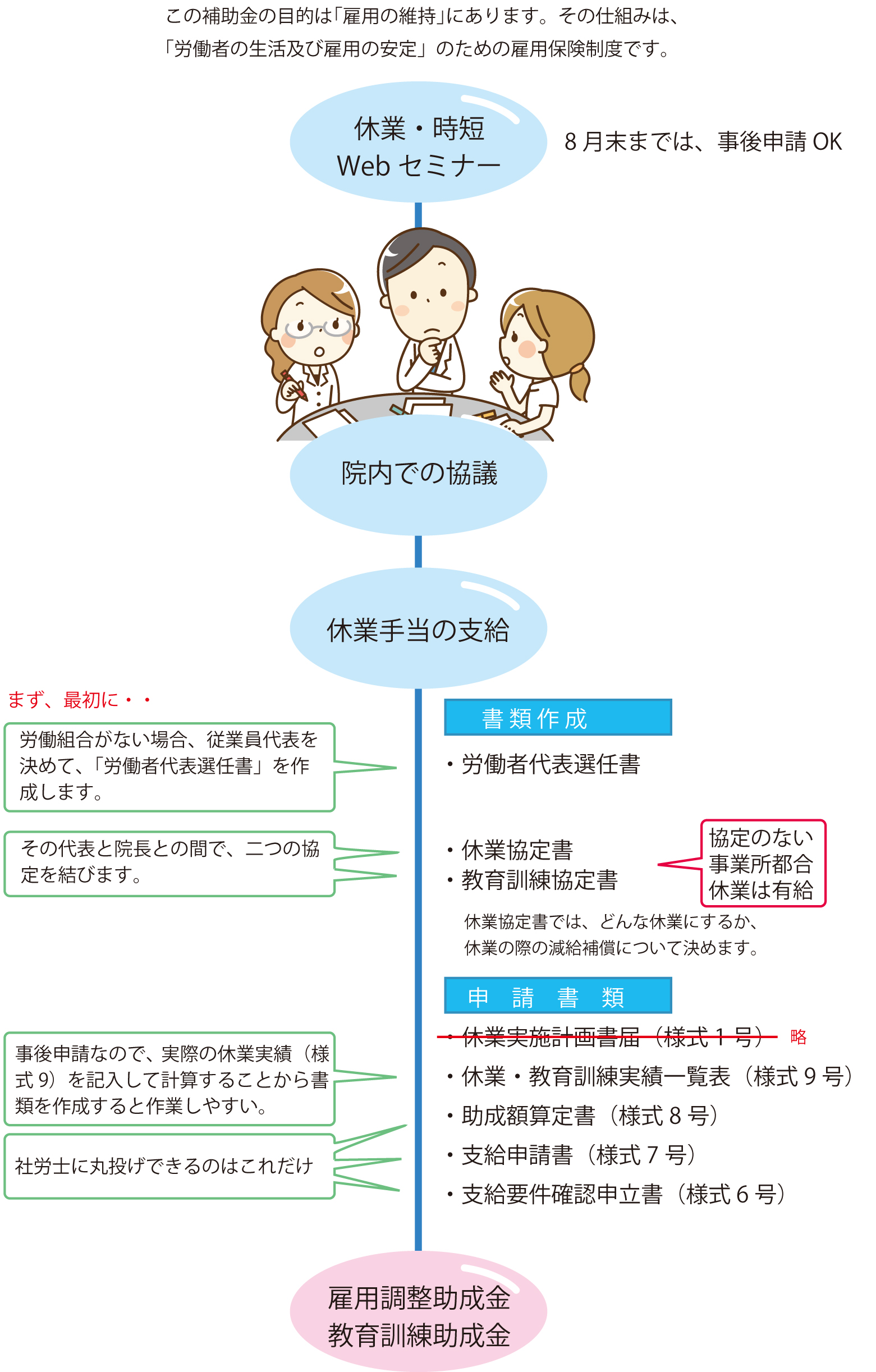 雇用調整助成金は、雇用を保全するために事業主を支援する仕組みです。制度の目的は、あくまでも労働者保護にあります。(このことを理解するだけで大丈夫)