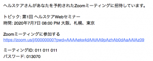 お申込時に、Zoom meetingのURLが記載されたメールが、申込みに使ったメールアドレスに送られます。